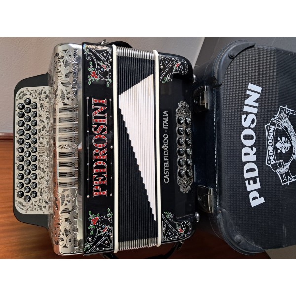Concertina Pedrosini, à 4ª voz, com afinação em GCF. Instrumento usado mas rigorosamente novo. Inclui estojo.
